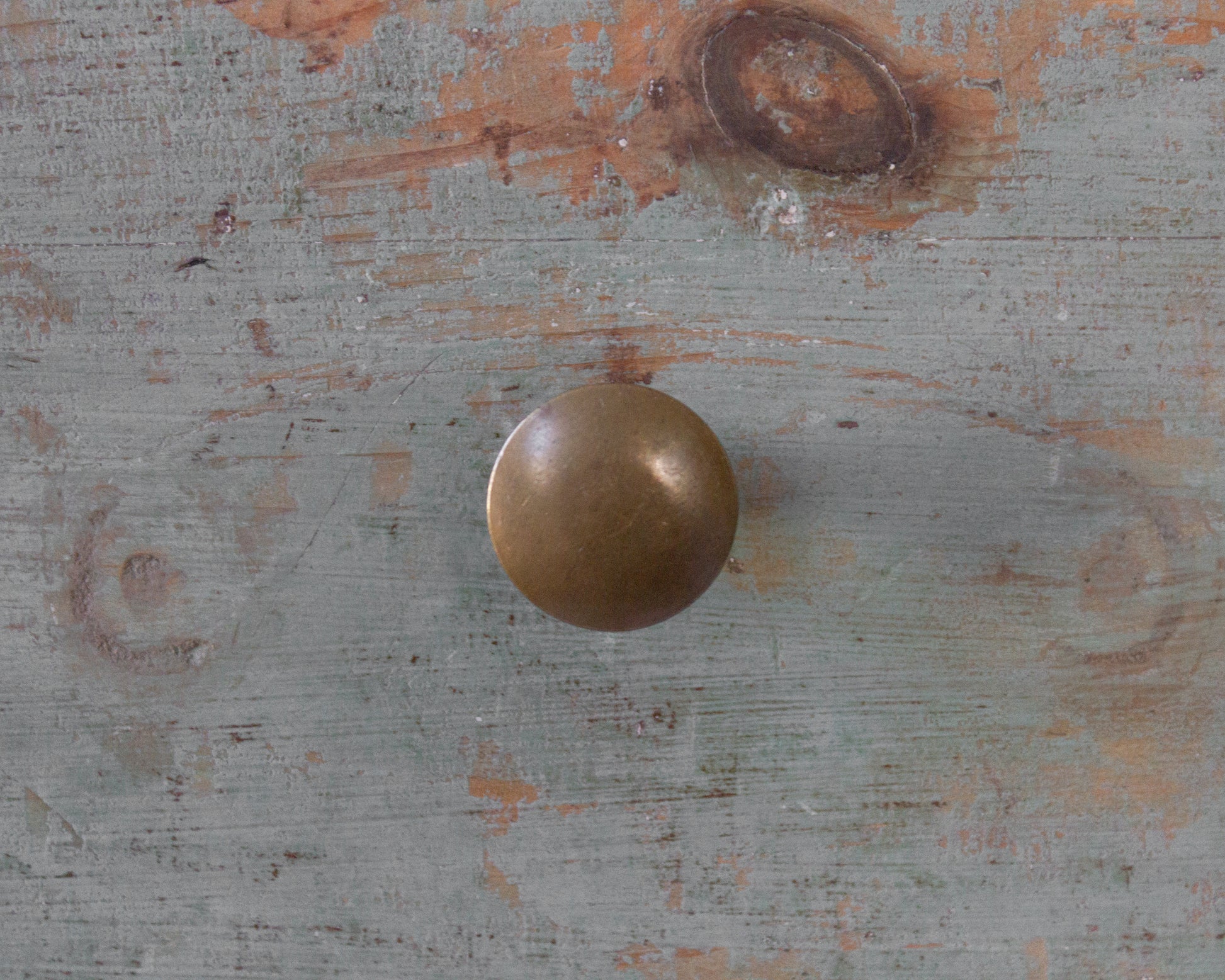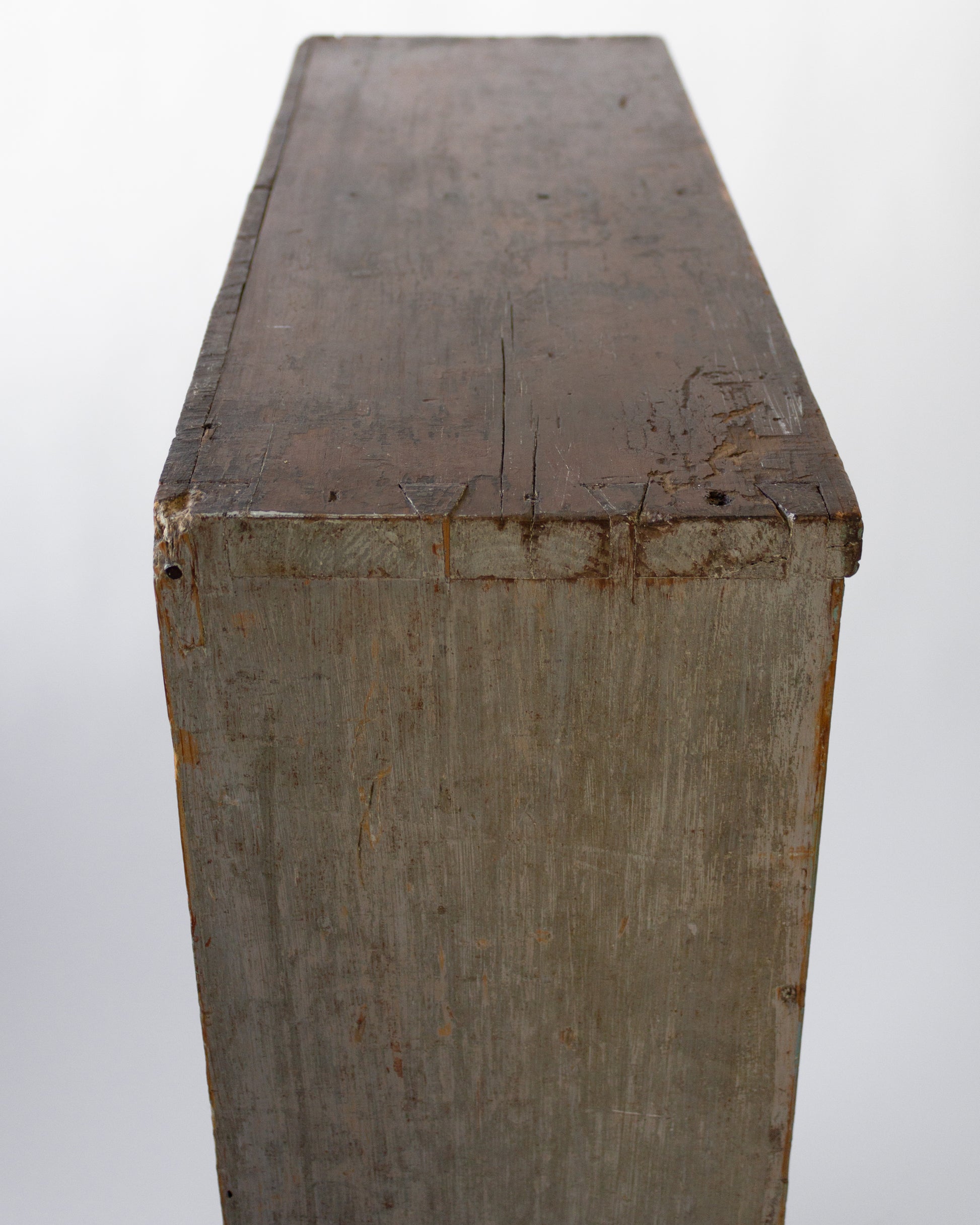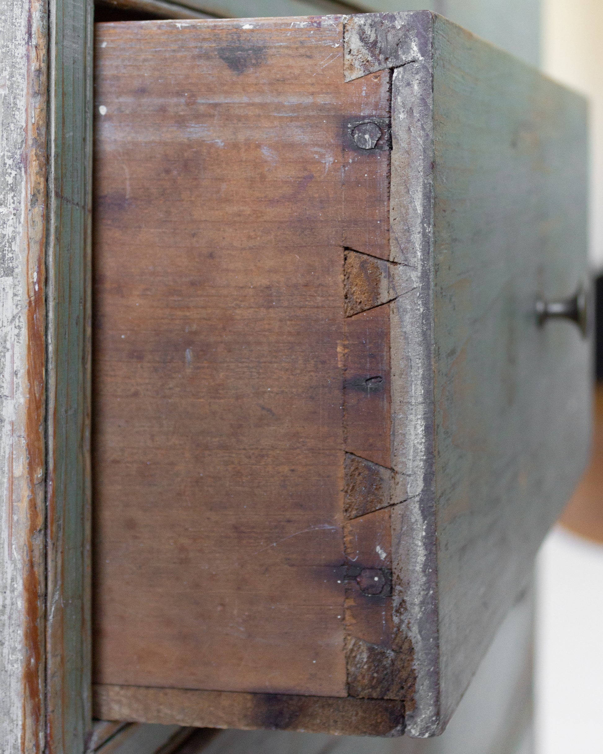 Early 19th century New England apothecary made from pine and retaining an old blue "verdigris" paint over the original stain. Dovetail construction with early forged nail reinforcements.