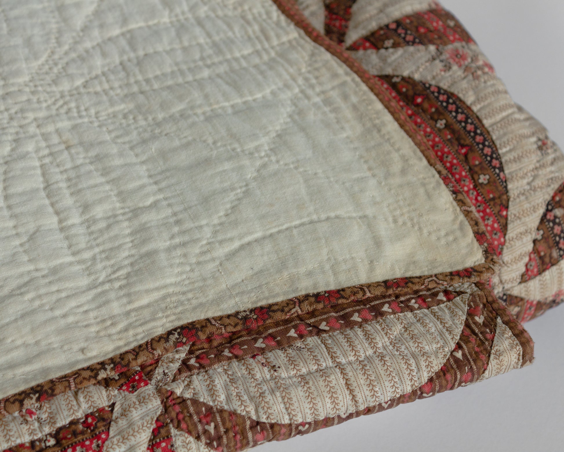 A circa 1840-60 quilt in a Robbing Peter to Pay Paul pattern with printed cotton top and a plain homespun linen backing. This is a very graphic motif in pleasing soft colors. My favorite detail of this quilt is the heart motif of one of the brown calico cotton prints.