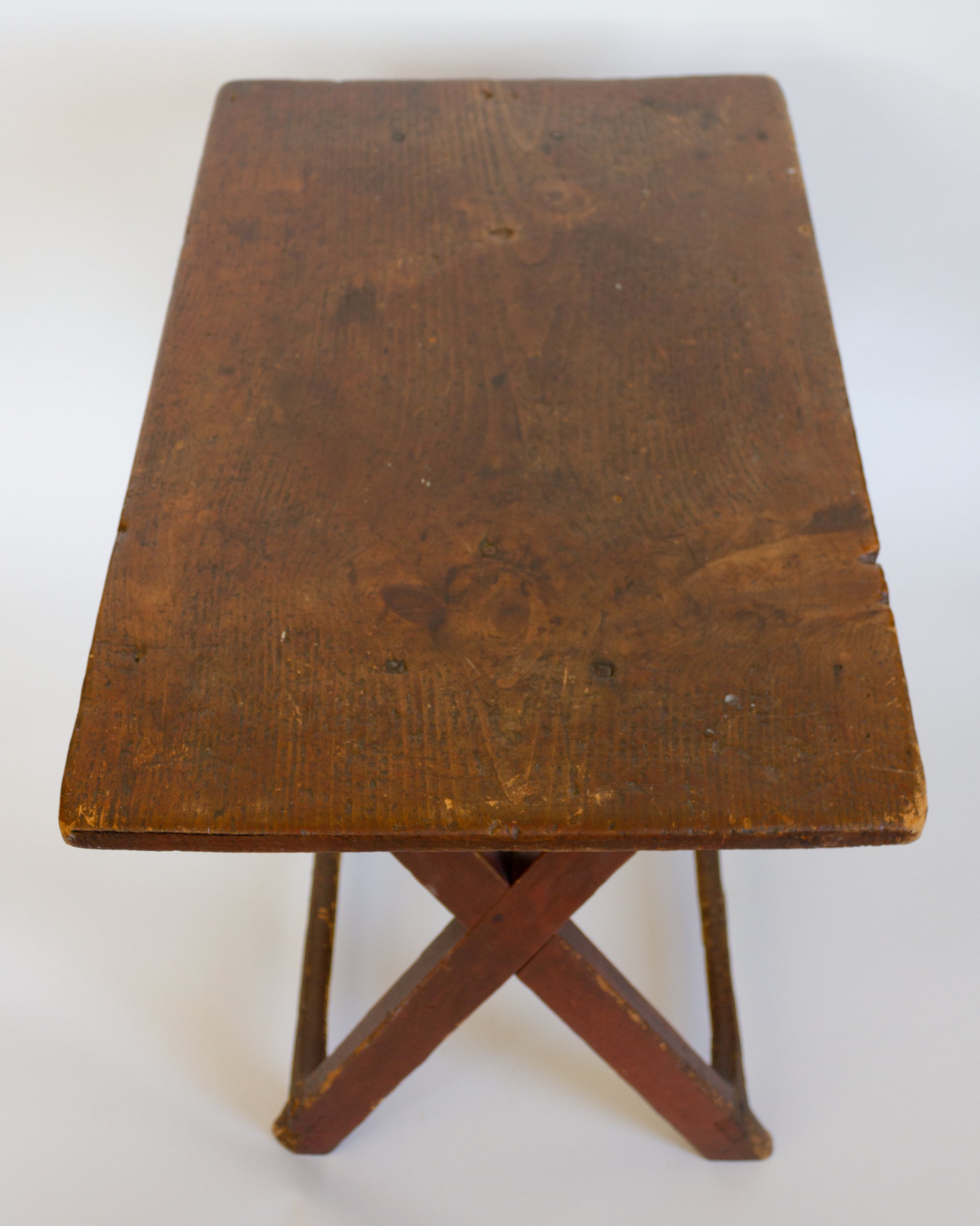 A circa 1800 New England sawbuck table in red paint with a scrubbed top. Exceptional surface, constructed with wooden pins, early forged nails, and clinched nails. The foot-worn base stretchers show many years of use as well as the wonderful patina on the table top. New Hampshire or possibly Maine.