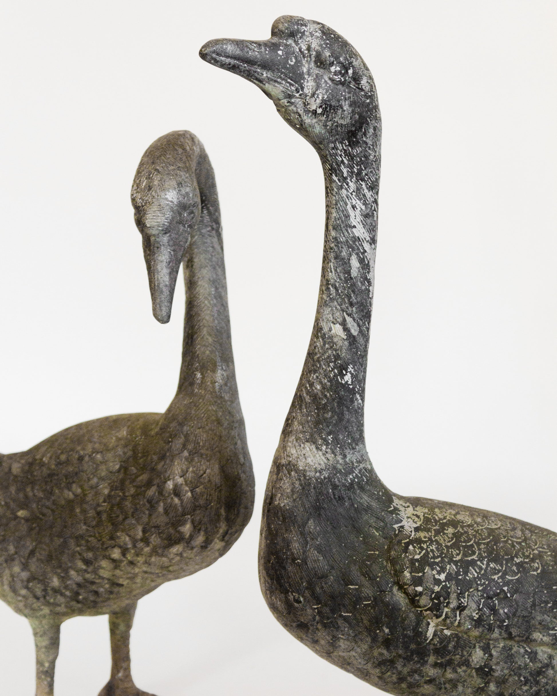 A charming pair of bronze patinated metal geese garden statues. Modeled after domesticated geese, this pair of "mates" caught my eye because of their graceful form as well as the way they so sweetly relate to each other. There is love here! First half of the 20th century.