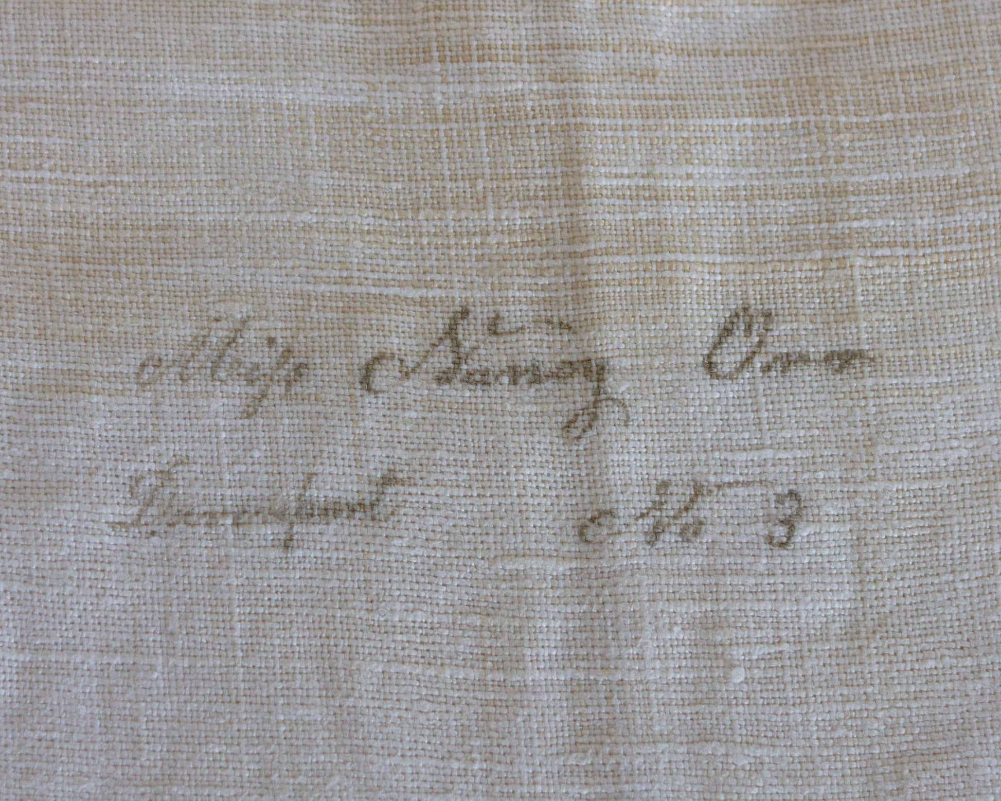 A pair of 19th c. American homespun linen, circa 1840. Delicate faggoting and fringe along the edge. With a handwritten identification label reading "(First word indistinguishable) Nancy Orr Davenport No 3"